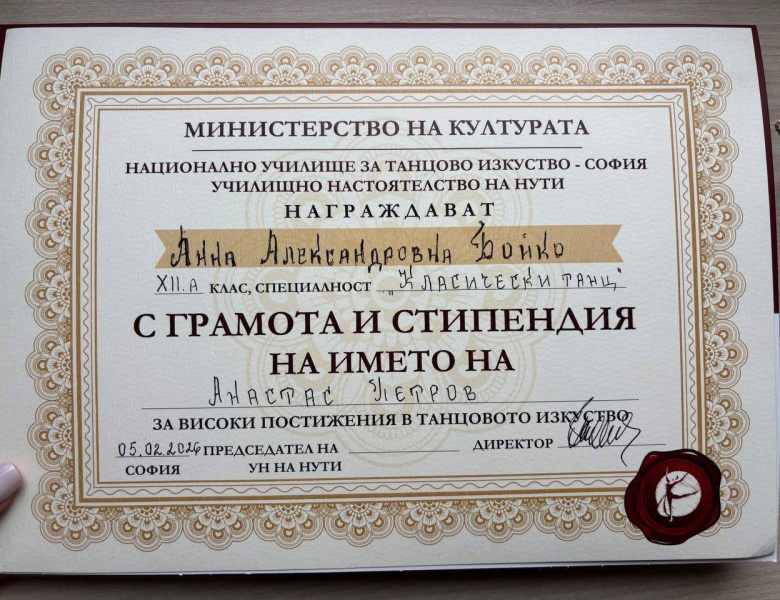 Випускниця Чорноморського ліцею ім. Т.Г. Шевченка 18-річна Анна Бойко отримала грамоту та стипендію від Мінкульту Болгарії за свої значні досягнення в галузі балетного танцю.