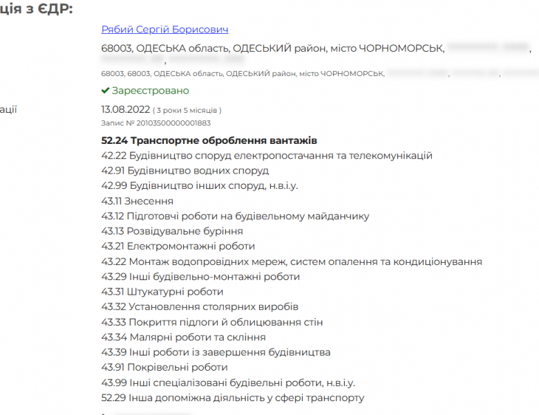 Водночас, як свідчать дані аналітичної платформи Clarity, Сергій Рябий значиться як фізична особа-підприємець з 2022 року, й абсолютно не спеціалізується на харчуванні, шкільних обідах тощо. Його специфіка - будівництво, штукатурні та малярні роботи.