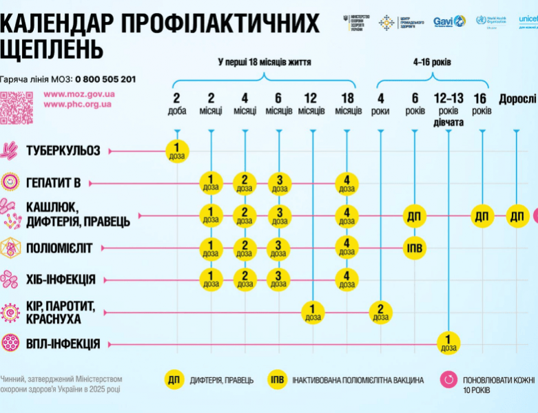 Оновлений календар щеплень охопить обов'язкову вакцинацію проти 11 інфекційних захворювань: туберкульоз, гепатит В, кір, паротит, краснуха, поліомієліт, дифтерія, правець, кашлюк, ХІБ-інфекція та вірус папіломи людини.